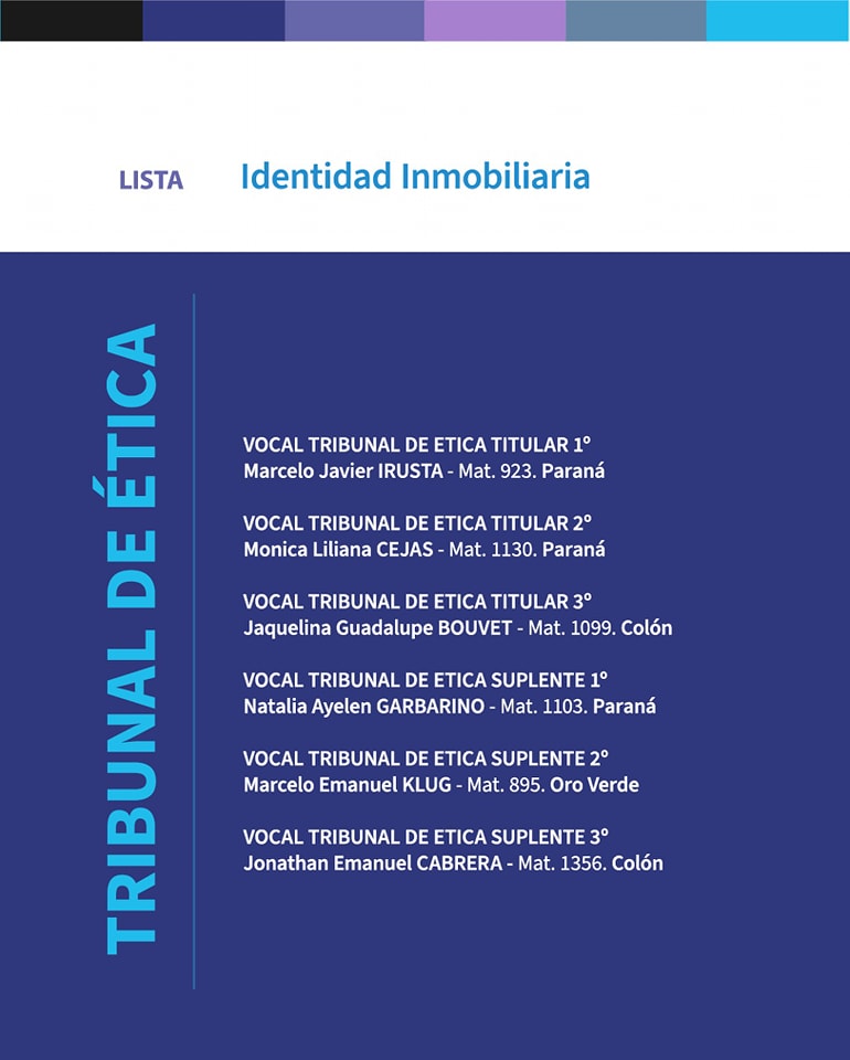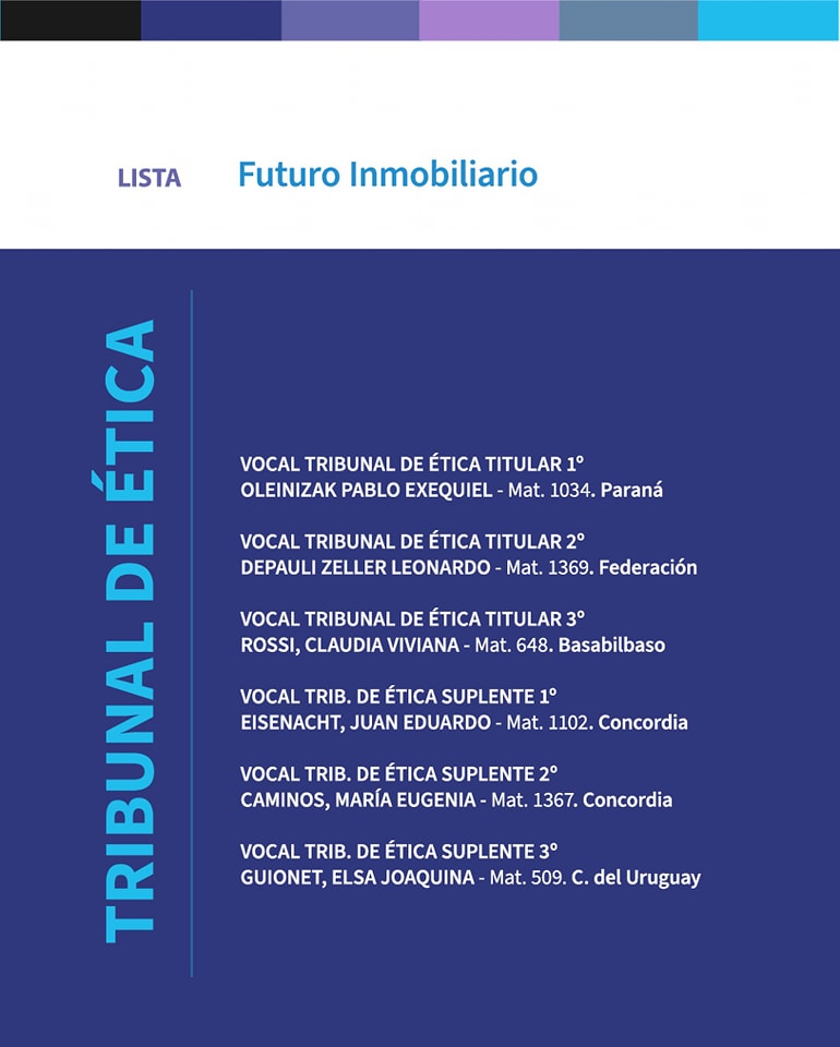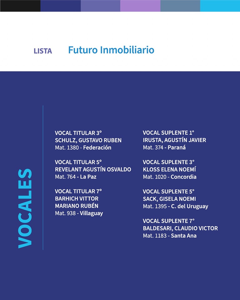 El artículo 28 de la Ley 9739 establece para el caso que se presente más de una lista “se hace necesario nombrar una junta electoral”. Cabe señalar que la misma está constituida por un representante de cada lista y 3 miembros del Consejo Directivo.